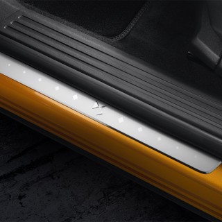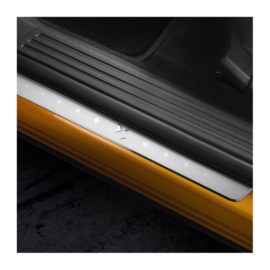 - Jeu de 4 enjoliveurs de seuils de portes avant et arrière aspect aluminium avec logotype "DS".