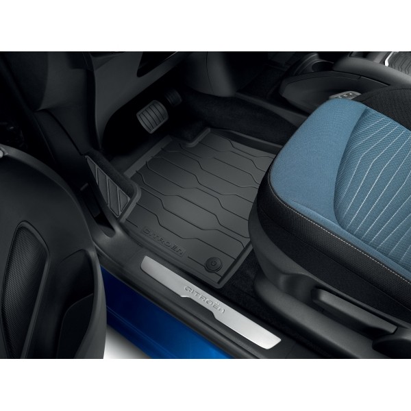 - Un jeu de 2 tapis avant et 1 tapis arrière monobloc en caoutchouc en forme de couleur noir, logotypé au nom de CITROEN.
